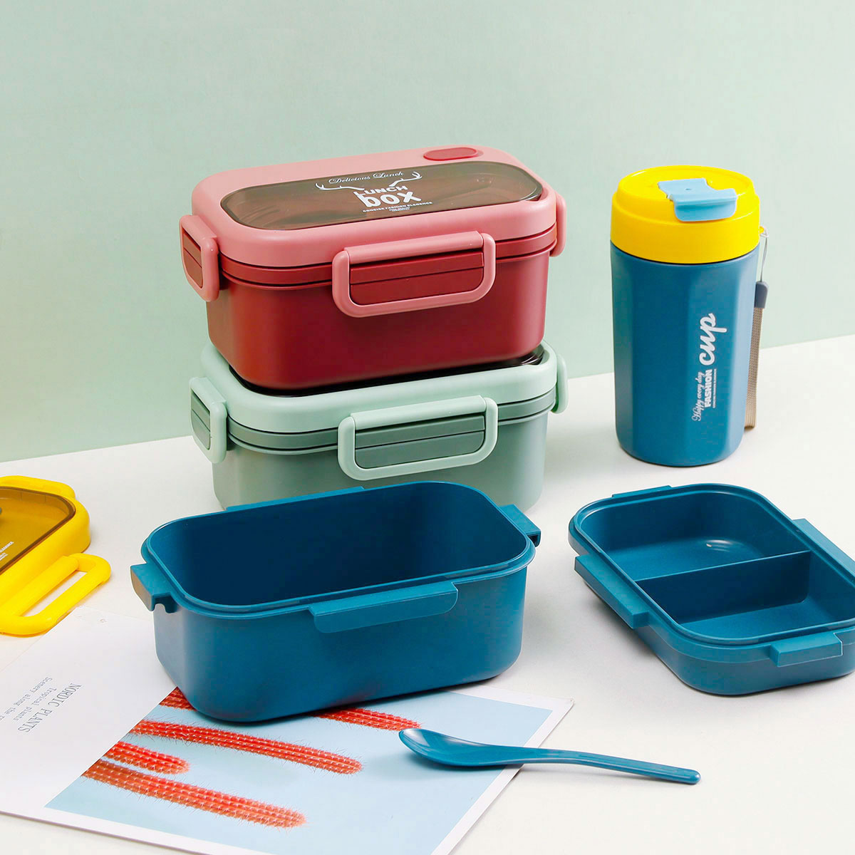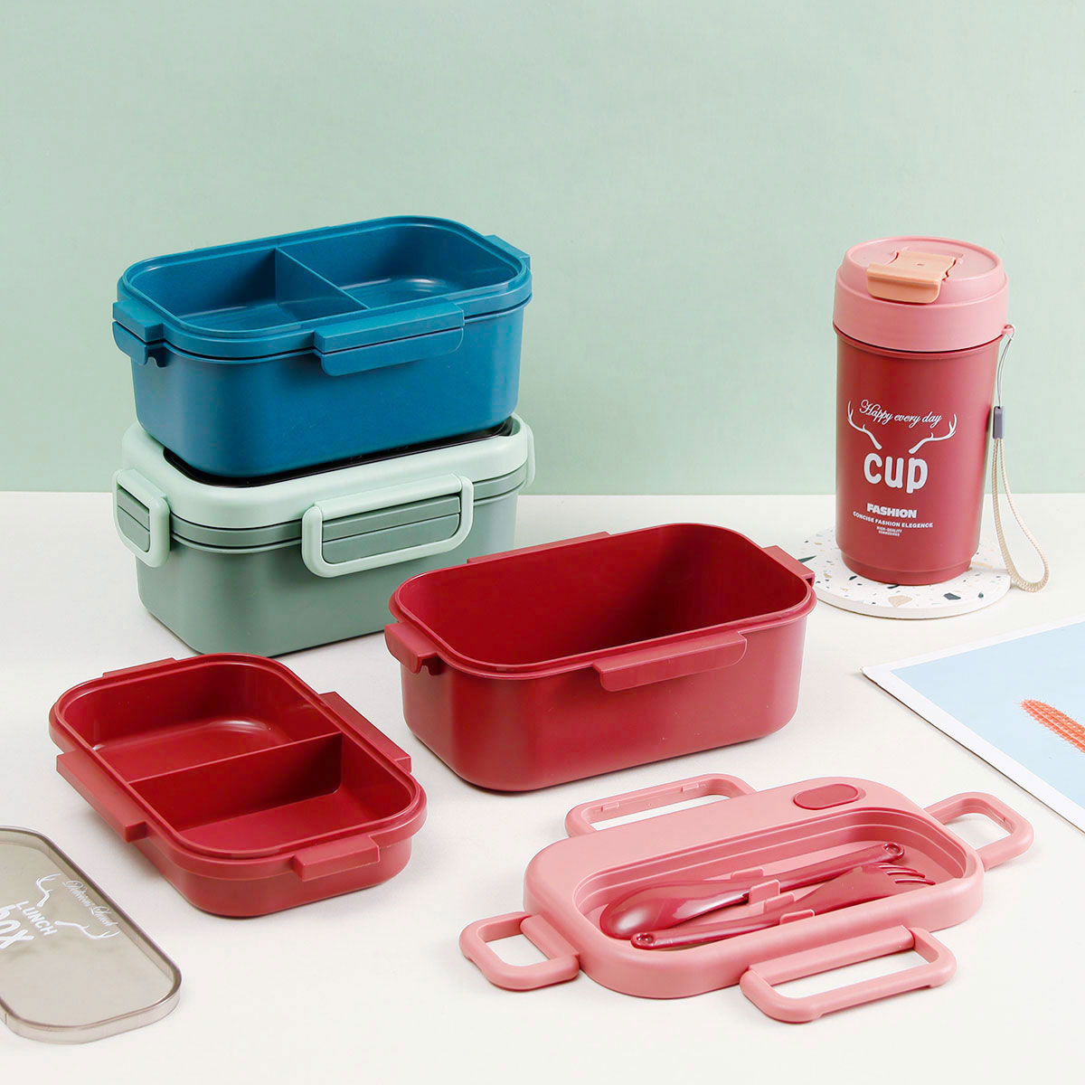 品悅長方雙層密封飯盒(1100ml)+圓形/八角隨行杯(500ml)