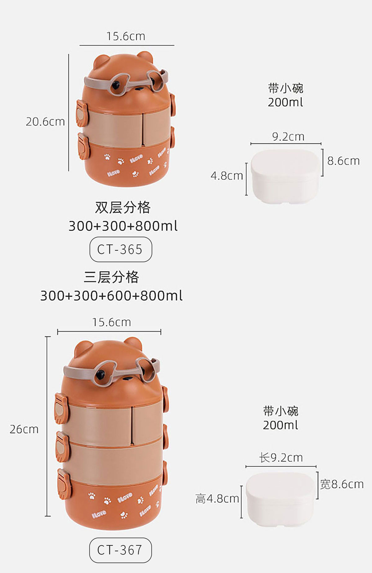 CT-365(雙層分格):156*206mm/300+300+800ml 內(nèi)格:92*86*48mm/200ml