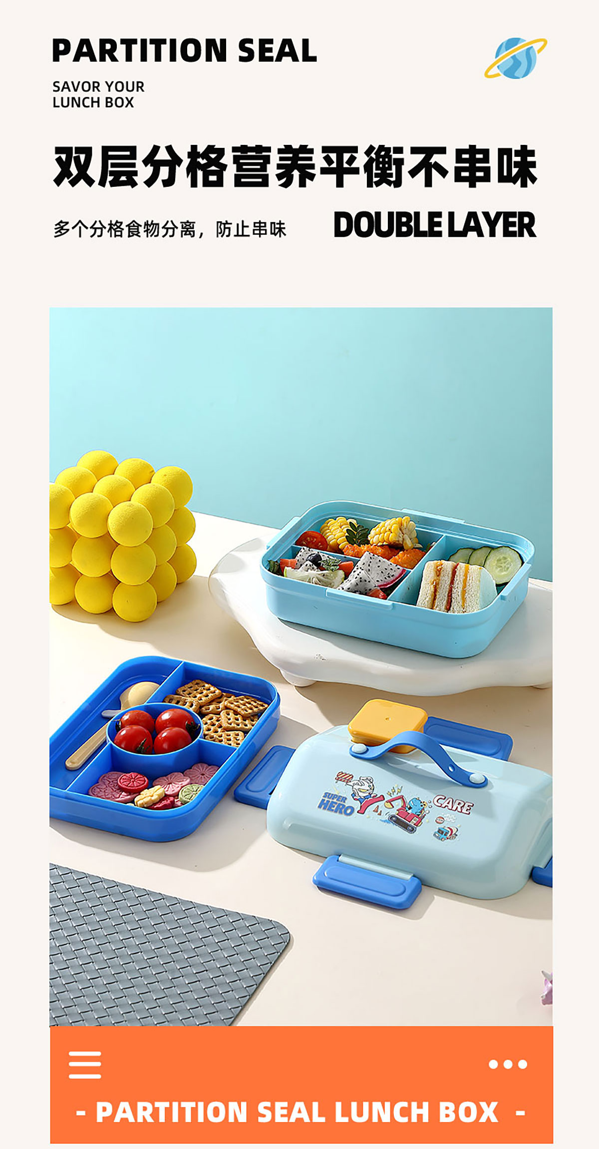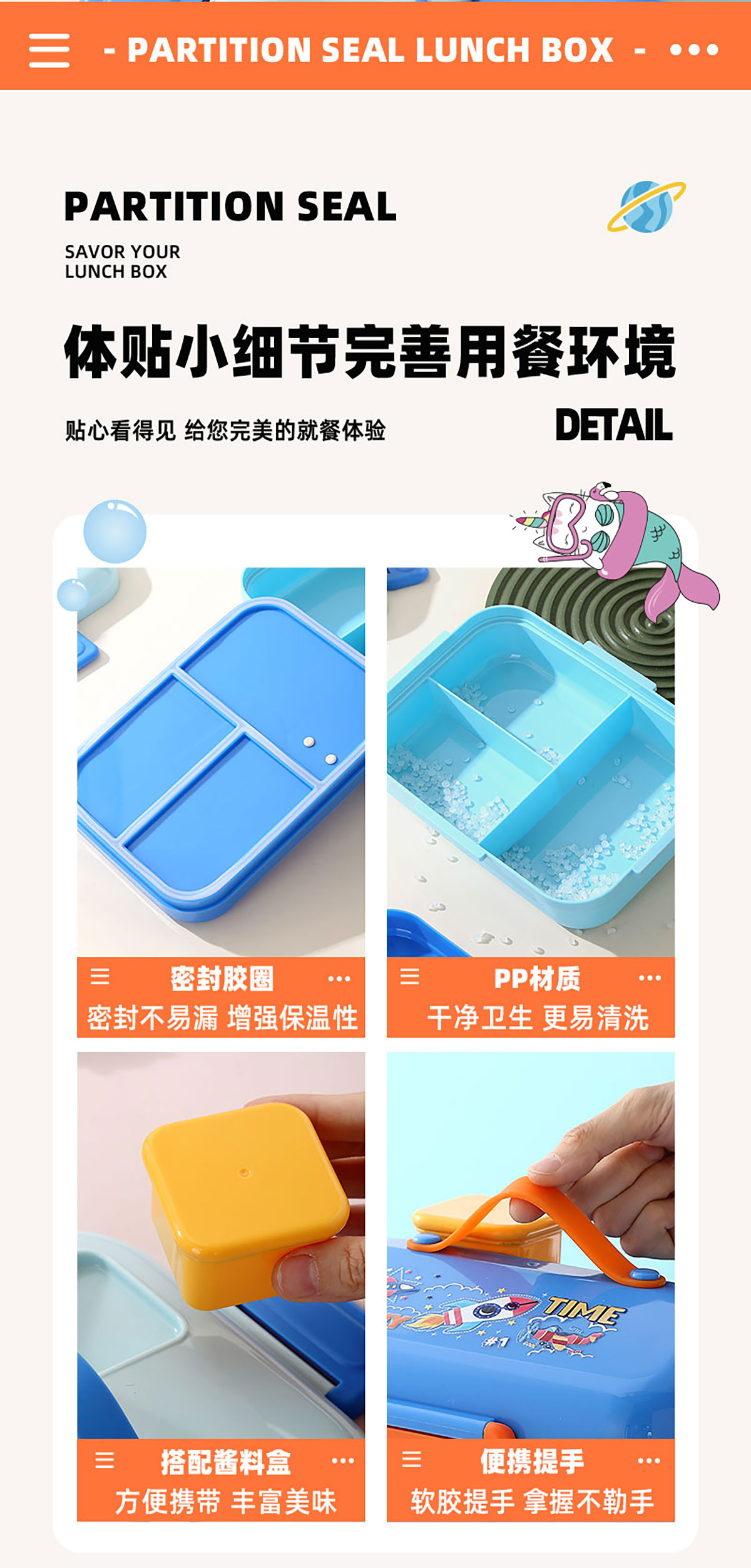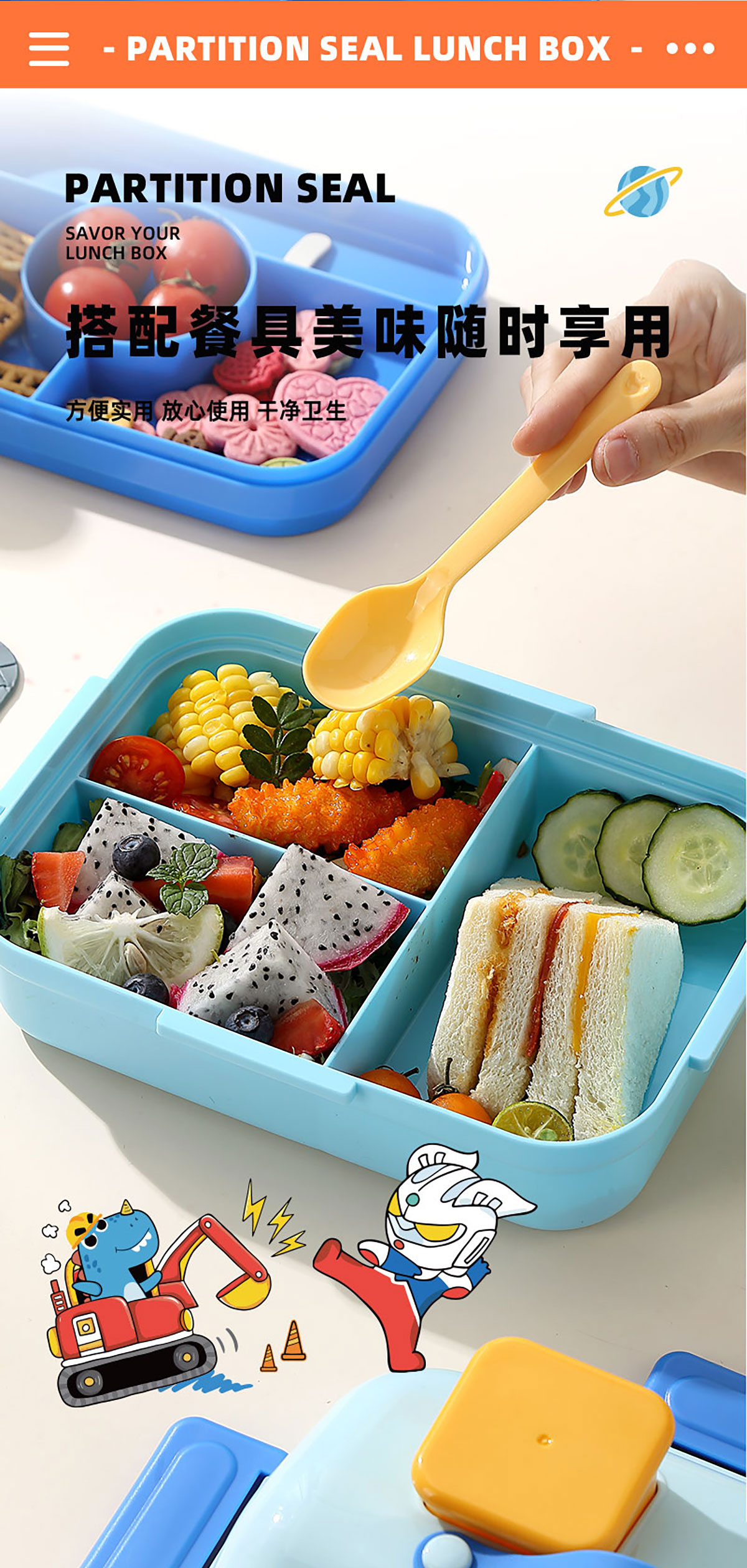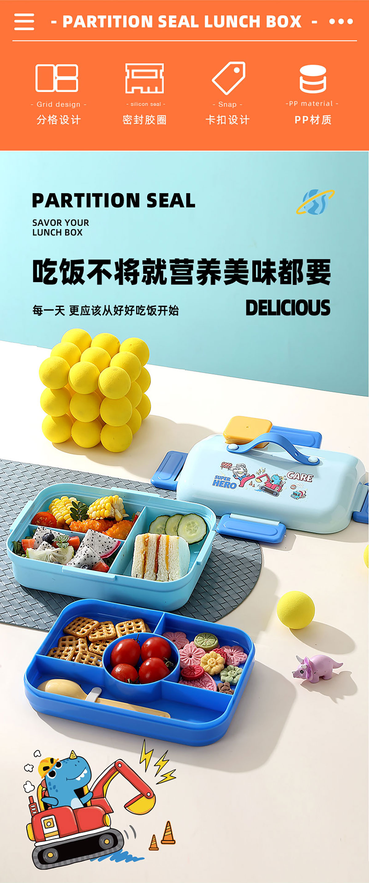 HOUSE房子不串味餐盒(長(zhǎng)方形塑料3格1270ml+碗70ml+PP勺)