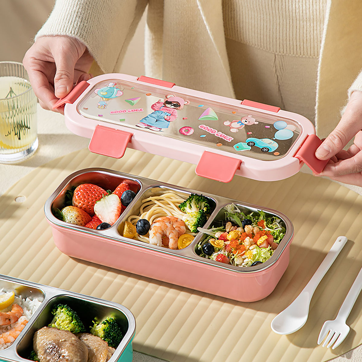 (印花款)愛(ài)悅長(zhǎng)方形便當(dāng)盒兩格/三格可選 塑料款/不銹鋼款